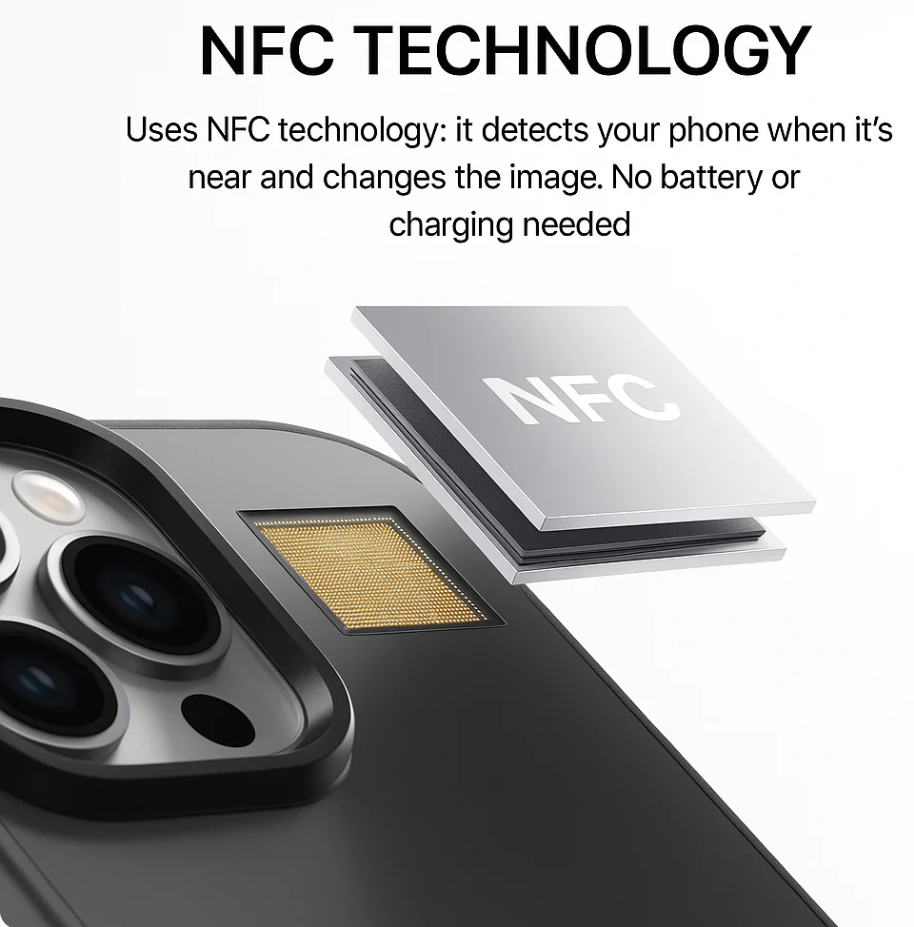 Bring your iPhone close — your case updates in 15 seconds. Change it anytime. No limits. Forever.